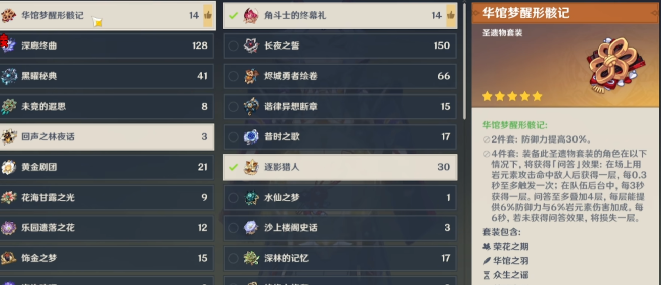若暂时无法凑齐华馆四件套,可选择逆飞的流星四件套作为过渡方案。该套装在护盾庇护下提供40%普通攻击与重击伤害加成,适合与钟离等护盾角色搭配使用。但需注意,逆飞套的增伤效果依赖护盾覆盖,实战中需确保护盾的稳定性。华馆与磐岩两件套的散搭组合(防御力+30%与岩伤+15%)也是过渡期的可行选择,但整体收益低于完整四件套效果。