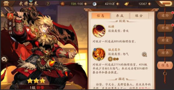 英雄培养需要注重资源分配,优先将进阶石、装备和宝物给主力输出。红将时代的赵云、孙坚值得重点培养,金将阶段则推荐小乔、陆逊和甘宁。甘宁的眩晕和命中加成能有效弥补吴国阵容的短板。不要忽视主角的养成,时装和化身的选择会影响主角的技能效果,红时装对战力提升尤为明显。
