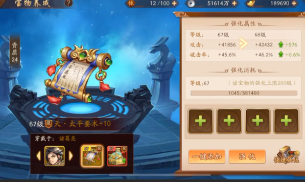宝物强化和精炼是提升属性的重要手段。精炼每级增加3%属性,最高15级共45%;强化每5级提升3%,满级100级可叠加60%加成。建议优先强化输出武将的宝物,尤其是攻击型宝物如孟德新书或太平要术,同时注意平衡属性,避免单一属性溢出浪费。防御型武将更适合搭配抗暴或格挡类宝物,例如丞相印能有效克制敌方暴击流打法。