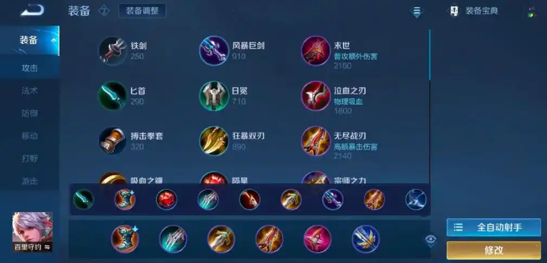 在装备选择上,核心思路是堆叠高额物理攻击力与穿透属性。起始装备可选择狩猎宽刃提升清野效率,加速发育。核心输出装以暗影战斧为基础,其提供的物理攻击、冷却缩减与护甲穿透,配合被动残废的减速效果,能有效提升守约的消耗与风筝能力。针对后期高爆发需求,碎星锤的高额物理穿透对坦克威胁显著,而多把无尽战刃的组合则成为极限秒人流的核心,其巨额物理攻击力直接转化为二技能的毁灭性伤害,实现远距离狙杀。续航与攻速方面,泣血之刃的物理吸血增强持续作战能力,纯净苍穹则提供攻速加成并将暴击率转化为物理攻击,其主动技能驱散也能在关键时刻规避集火。破军作为终极装备,其高攻击力加成与对低血量目标的额外伤害,大幅提升收割效率。鞋类选择急速战靴,其攻速提升对依赖普攻补伤的守约尤为重要。