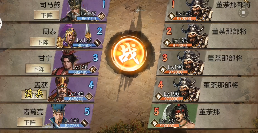 最终阶段由觉醒夏侯惇和副将曹仁负责,装备四级极灵龟和2青铜剑。在前武将的配合下,夏侯惇只需正常发挥即可确保通关。这种打法与其他攻略的最大区别在于将反战法的目标锁定为主将董荼那,大幅降低了通关难度。整个过程中,貂蝉的首发、甘宁的多次战法释放、关羽的承上启下以及周瑜/周泰的稳定输出都至关重要,各环节需紧密配合才能确保胜利。