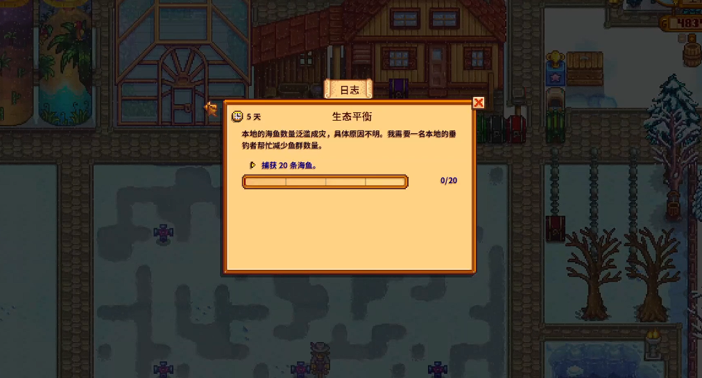 生态平衡任务是星露谷物语中一个比较有趣的特殊任务,完成它可以获得农场电脑配方和1500金币的奖励。这个任务需要在第一年秋季的第二天前往小镇触发剧情,镇长和罗宾会在看板前讨论河鱼泛滥的问题,这时候就能接取任务了。任务有两个可选目标:钓20条鱼或者出售100份苋菜,建议选择后者,因为种苋菜比钓鱼更省时间,尤其是如果你已经提前种好了苋菜,直接出货就能轻松完成。