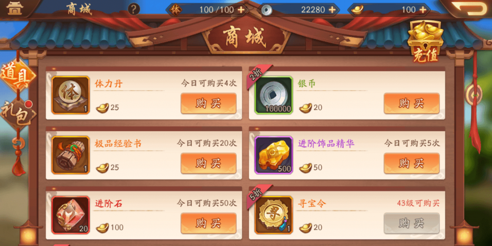 开服七天的元宝别乱花,每天商城里的体力丹必须买满,这是保证进度不落后的基础。寻宝令每天买两个就够,既能攒着合碎片又不会浪费元宝。有条件的话订阅和双月卡性价比极高,尤其是订阅送的体力丹积累起来很可观。元宝主要留着买必用的体力丹和关键活动道具,像竞技场挑战令这类折扣品值得入手,其他花里胡哨的礼包直接无视。神兵和宝物系统解锁后,优先凑增加主力输出的套装属性,蓝色宝物也能过渡,精炼选攻击加成;橙色神兵虽强但获取太难,别强求。