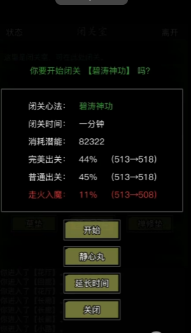 走火入魔的具体影响不仅限于数值下降,还可能间接拖累整体游戏进度。基础内功等级降低会减少气血等属性加成,影响角色在副本或任务中的生存能力;而内功武学等级降低五级则削弱技能效果,导致输出伤害不足或防御力下降,这在后期高难度挑战中尤为致命。为避免这种损失,玩家须优先考虑闭关成功率因素,如延长闭关时间可提升成功概率,并通过使用道具静心丸来额外增加10%的成功率,同时消除走火入魔风险,确保闭关收益稳定。