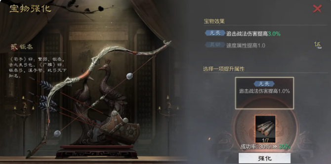 宝物的培养是一个循序渐进的完整流程,主要包括强化、进阶和锻造三个环节。强化是使用青铜锭、梧桐木等材料提升宝物基础属性数值的过程,成功率为100%,但罕俦品质后需要选择强化方向。当宝物强化到5级后,可以消耗赤珠山铁或小叶紫檀等进阶材料,通过工匠将其品质从精品提升至罕俦,再至稀世,每次进阶都会大幅提高属性上限并可能解锁新的效果。锻造则是宝物成型的最后一步,当稀世宝物强化到10级后,消耗2个进阶材料开启,可以为宝物赋予强力的特殊词条。