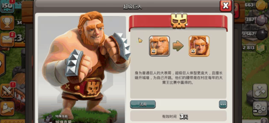 除了常规的巨人,游戏中还存在一种强化版本——超级巨人。解锁超级巨人的前提条件更为严格,它要求你的大本营等级必须先达到11级,并且普通巨人兵种本身的等级也需要满足特定要求。满足这些条件后,你才能进行后续的强化操作,这是获得超级巨人的必经阶段。