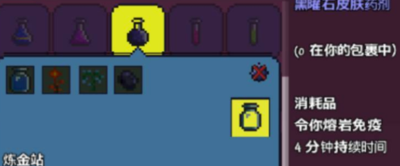 另一种有效的方法是使用黑曜石皮药水,它能在6分钟内提供完整的熔岩免疫效果。这瓶药水需要在放置的药桌或瓶子处,使用水瓶、火焰花、幌菊和黑曜石进行合成。这是一种消耗性的但持续时间长的解决方案,适合需要长时间在熔岩环境作业的情况。