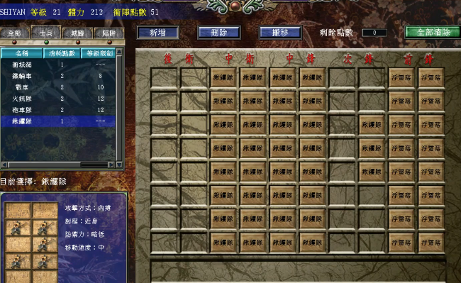 当武将等级继续提升到12级左右,可以考虑进行新一轮的布阵优化。此时可以解锁火铳兵,这是一种远程兵种。变阵方案是在完成前排浮雷落布设的基础上,将后排的廉价士兵逐步替换为火铳兵,他们能在后方安全位置清除穿过陷阱的零星敌人,进一步降低战损。布阵时注意将陷阱交错摆放,避免留下让敌方直冲过来的通道。这套组合在中后期面对强化的敌方AI时依然非常有效。