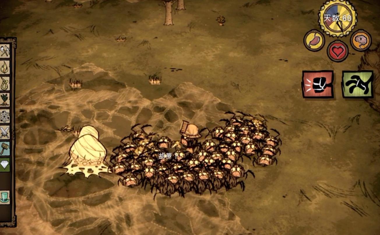 蜘蛛丝能用来做帐篷、捕虫网、高礼帽这些实用道具。想弄到蜘蛛丝其实不难,关键得找到蜘蛛巢。地图上那些白色的小土堆就是蜘蛛巢,靠近它们就会有蜘蛛跳出来,这时候咱们得小心点,别被围攻了。白天蜘蛛比较懒,一般只出来一两只,黄昏和晚上它们就活跃多了,所以最好挑白天去收集。打蜘蛛的时候注意走位,等它扑空再反击,这样能无伤搞定。