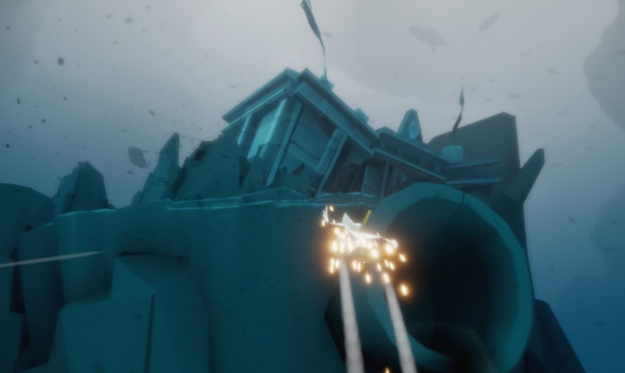 进入暴风眼后记得切换成滑翔模式,这样能更好地控制方向。看到黄色光芒就朝那个方向飞,遇到直角建模的水池就直接飞进去。在水池里往左边游能找到缺口,从这里穿过去就能绕过大门直接进入第二阶段。如果能量不够可以靠近云层恢复,但别在云里待太久容易迷失方向。