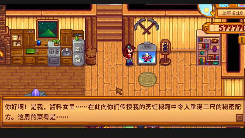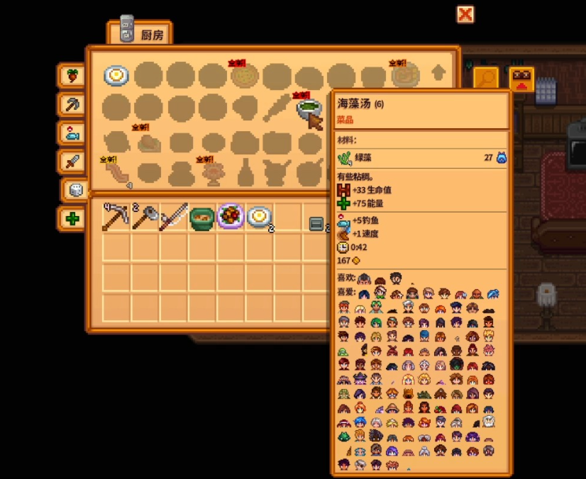 烹饪界面操作逻辑简单直观,右键点击烤炉进入制作页面,左键选择食谱即可完成。错误操作不会消耗材料,可反复尝试配方组合。部分特殊料理如生鱼片需通过提升流浪汉莱纳斯好感至3星后邮寄获得配方。注意每日观看电视节目避免错过食谱,重播需等待次年同日期。冰箱内食材与背包物品会被同步识别,但鱼缸存储的鱼类不计入材料库。