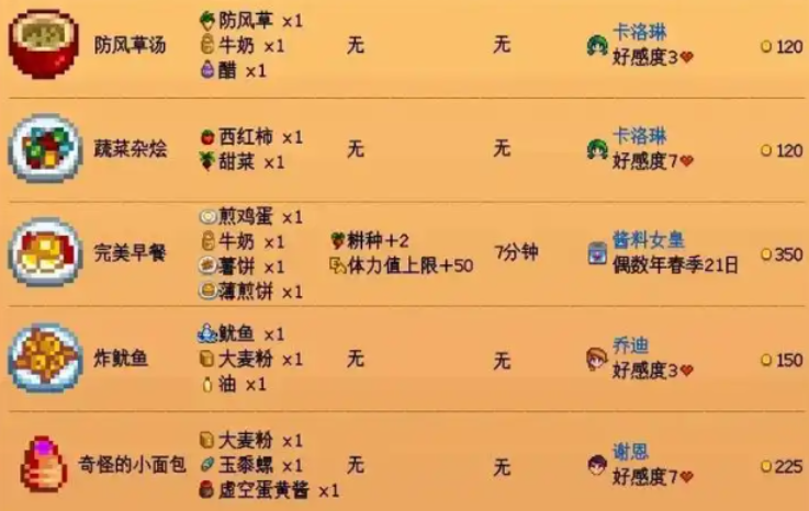 游戏内共82道可烹饪菜肴,按季节分类能优化食材管理效率。春季推荐防风草汤,夏季侧重海泡布丁,秋季主打南瓜汤,冬季依赖奶酪补充体力。下矿探险建议携带三倍浓缩咖啡加速移动,配合幸运午餐提升暴击率。食物品质影响恢复数值,普通、银星、金星、紫星分别提供100%、120%、140%、160%基础效果,但增益属性不受品质影响。