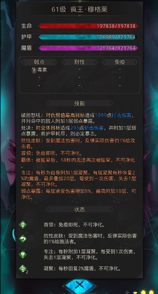 推开石棺见到矮人国王疯王穆格莱时,需要先了解其战斗机制。疯王拥有较强的范围攻击能力,战斗中会释放多种负面状态技能。可以在战术里面把2鼓舞开到持续释放,持续释放,关掉指令射击晨光传承者,可以直接治愈不足99%时候释放,抚慰不足60%,至少2个友方。圣灵召唤从不释放。这些战术设置能有效应对疯王的技能机制,确保队伍生存能力。