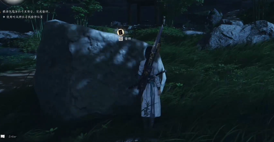 要完成偷师取之有道任务,玩家首先需要前往清河地区的隐月山,在地图右下角或右侧区域找到NPC仇越海并与之对话,从而接取名为偷师·取之有道的任务。接取任务后,利用游戏内的任务追踪功能,可以引导你前往一个特定的地点,在那里你需要使用听风辨位或听声辨位技能来探查环境,技能会提示最佳偷师位置通常在一块巨石后面。