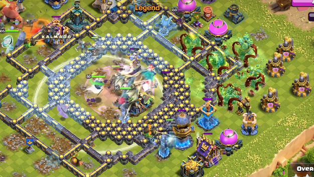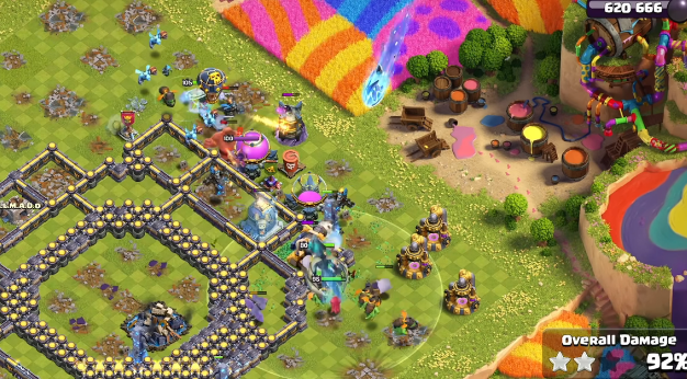 骷髅气球作为空中召唤单位,优先锁定防御建筑,被击破后会释放大量地面骷髅,适合夜世界缺少地面前排的场景,搭配异变亡灵可形成空中掩护与地面输出的组合,推进时能绕过城墙直接切入核心区域,适合针对分散布置的防空与法师塔阵型,不过自身移动速度较慢,容易被多头地狱塔与防空火箭集火,需要提前用冰冻或狂暴法术保障生存,避免未落地就被摧毁导致骷髅无法生效。女巫召唤的骷髅无护盾但持续生成,配合治疗法术可维持人海密度,适合长时间攻坚与清理边缘建筑,在大部队后方部署能持续补充战力,应对多头防御塔与炸弹塔时效果显著,缺点是惧怕范围伤害,一旦被法师、飞龙等单位覆盖会快速减员。