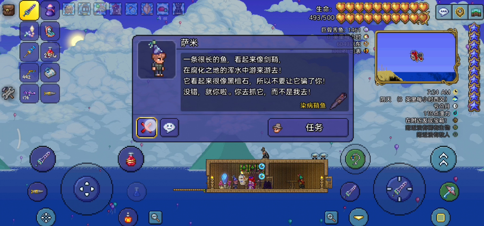 钓到天使鱼,首先得找到渔夫接任务。每天凌晨4:30后,渔夫会刷新新任务,记得带上保险箱和鱼竿,直奔天空岛的天湖。天空岛一般生成在森林生物群落上方,高度接近太空层,用重力药水或翅膀飞上去比较方便。如果运气好,地图上可能已经有现成的天湖,否则就得自己用方块搭一个水池。钓鱼时记得用高级鱼饵,比如大师鱼饵,能显著提高钓到任务鱼的几率。